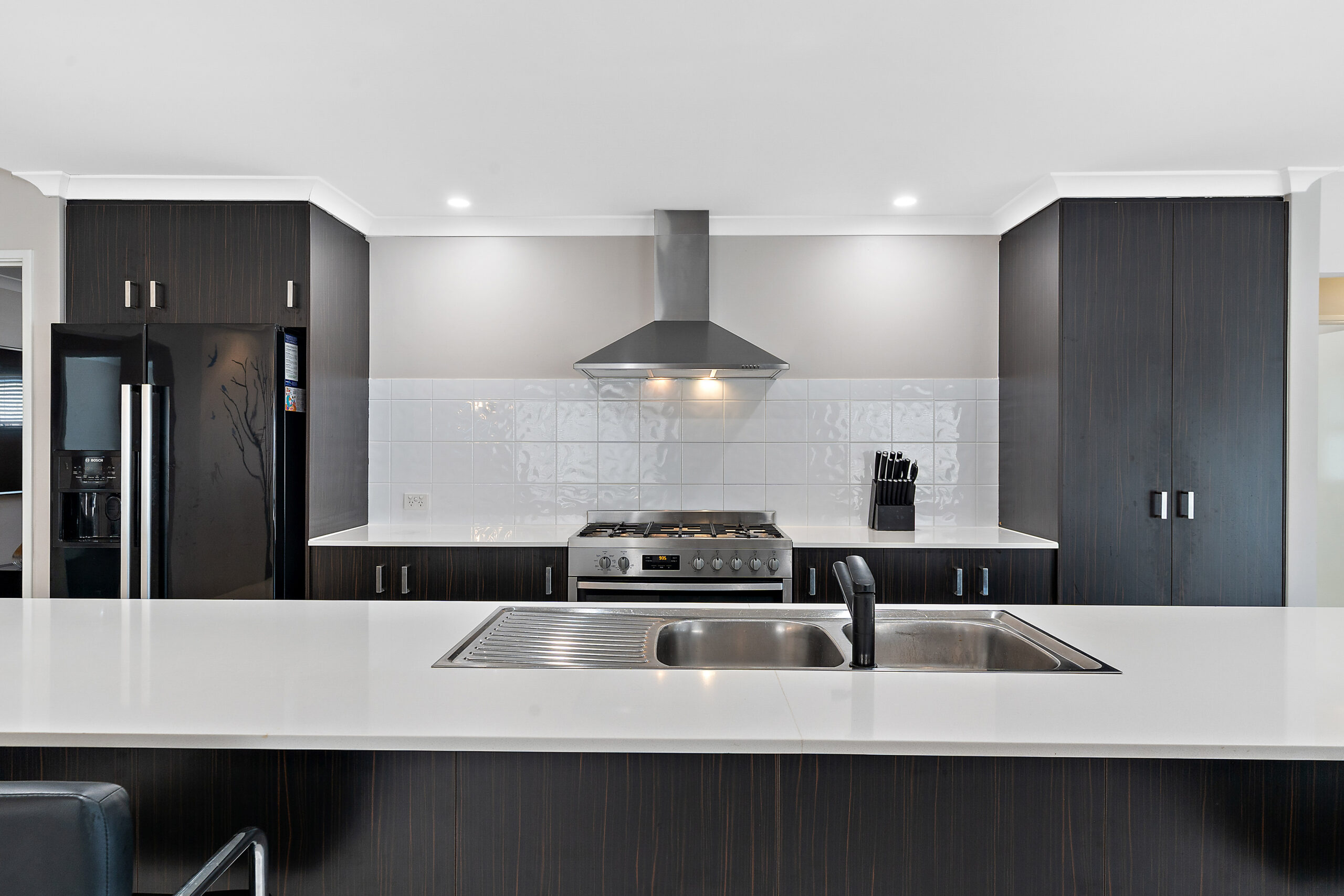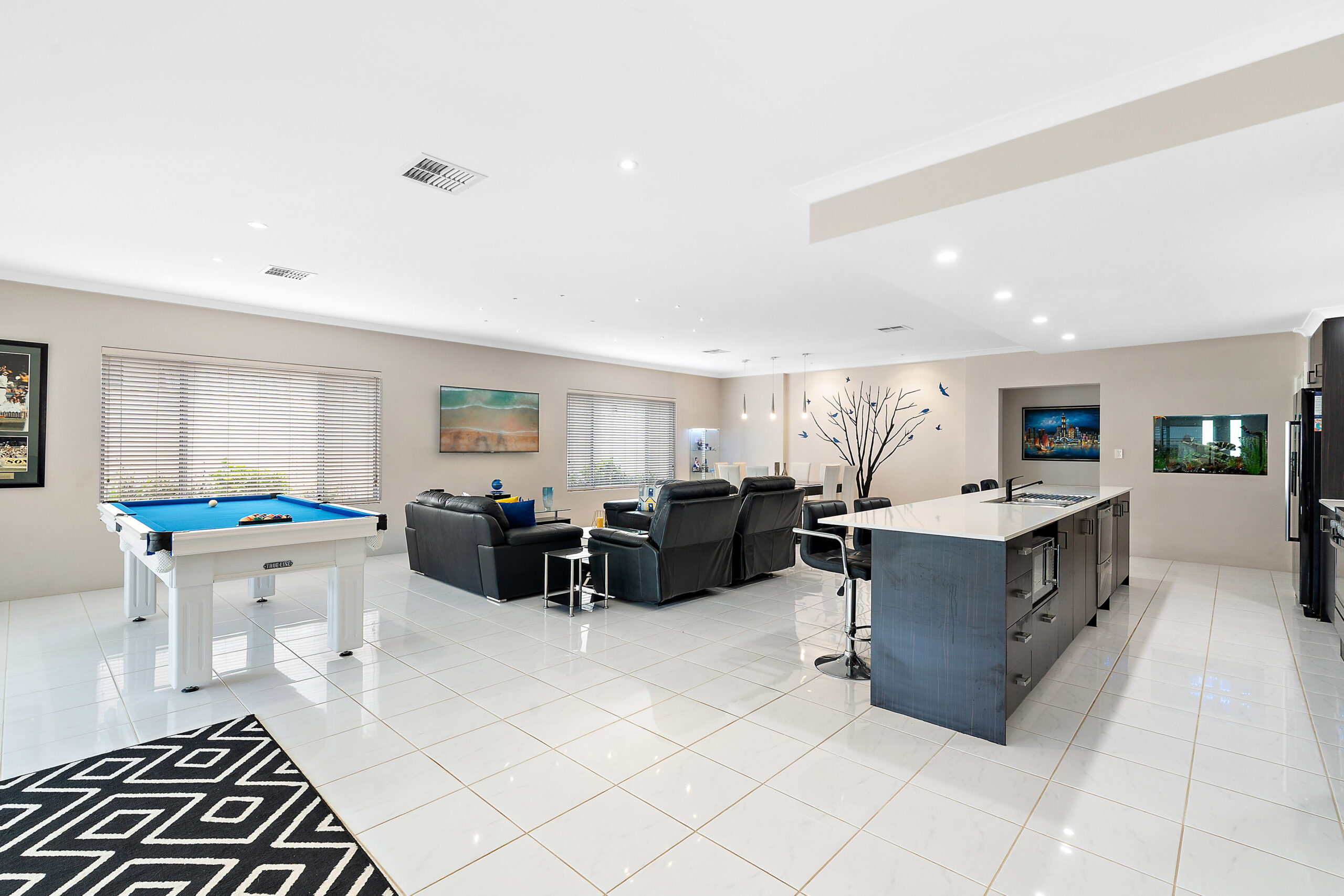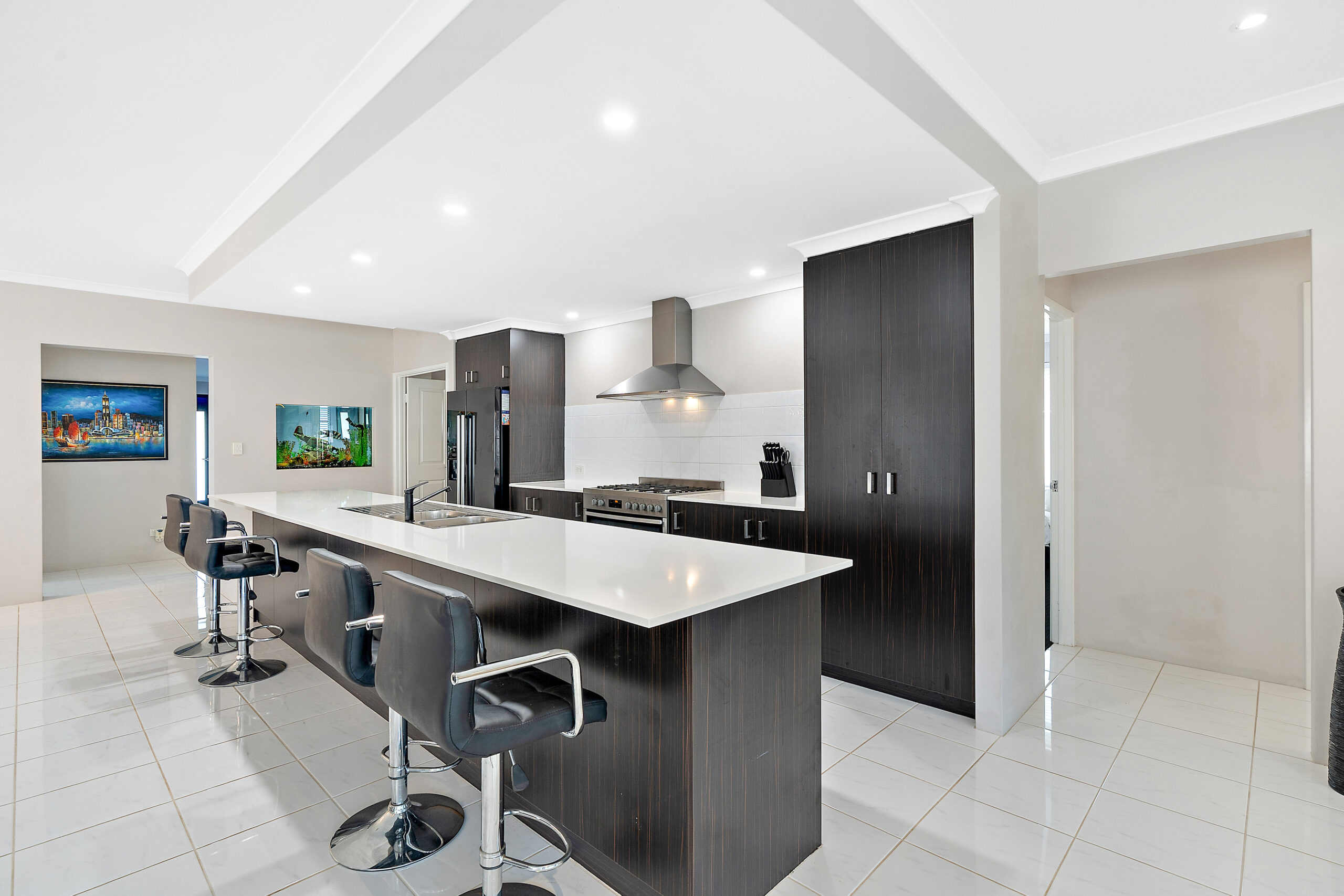 Open plan kitchen with stone benchtops, island bench and 900mm appliances.